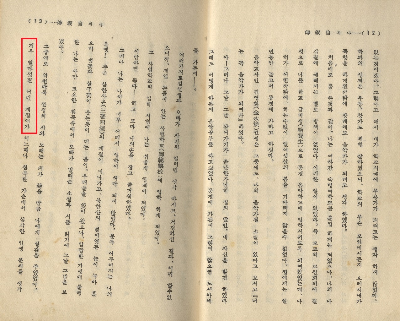 “모교의 교원회의 결과, 나를 학교 급비생(=장학생)으로 동경음악학교에 입학시키기로 하였다. 그런데 나이가 어린 까닭에 하는 수 없이 열여섯 살이 되는 봄까지 기다려야 한다는 것이었다. 집에서 일 년 동안 있다가 동경에 가라는 결정이 내려졌다. (<나의 자서전>, 1936:22-23쪽)